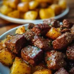 This dish cooks fast and uses the air fryer. You get tender steak bites and crispy potatoes in one meal. It is simple, full of garlic butter flavor, and clean up is easy.