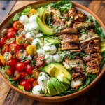 This salad mixes warm grilled chicken with fresh avocado, tomatoes, mozzarella, and basil. It tastes bright, fresh, and filling. You can make it fast and it works as lunch or a light dinner.