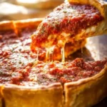 Chicago Style Deep Dish Pizza is thick, filling, and full of cheese. It is a great meal when you want something warm and comforting. The deep crust holds a lot of cheese and sauce. It feeds a family and is good for leftovers.