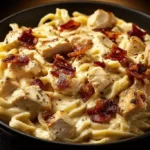 5. Combine: Add the cooked pasta to the sauce, then mix in the chicken and garnish with bacon. Serve warm.