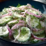 A refreshing salad with crisp cucumbers, red onion, and a creamy yogurt dressing, perfect for hot days.