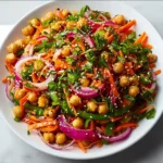 Start by rinsing and draining the chickpeas. Toss the vegetables and chickpeas in a big bowl. Whisk the dressing until smooth. Pour the dressing on the salad and toss gently. Top with peanuts, cilantro, and sesame seeds. Serve right away for the best crunch.