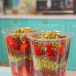 - Layer in cups: strawberries, konafah-pistachio mix, melted chocolate, and chopped pistachios.