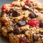 Make the dough by mixing oats, mashed banana, chopped strawberries, and almond butter. Fold in the chocolate chips. Form small balls, press them into cookie shapes, and bake until the edges turn golden. Let them cool on the tray, then move to a rack.