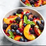 A fresh and bright fruit salad featuring juicy peaches, berries, and a tangy honey lime dressing, perfect for summer picnics or as a light dessert.