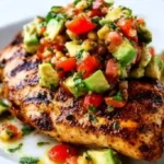 Marinate the chicken in lime juice, chili powder, salt, and pepper. Let it rest for at least 30 minutes so the flavors sink in. Heat the grill to medium-high and oil the grates. Grill the chicken 6–7 minutes per side until it is cooked through. Let the chicken rest a few minutes so the juices settle. Top each breast with diced avocado and chopped cilantro before you serve.