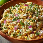 This salad mixes familiar pasta with bright Mexican street corn flavors. It is fast, fresh, and good for hot days, potlucks, or family dinners. The salad has cream, lime, spice, and cheese that many people like.