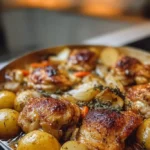 A warm and simple one-pot meal filled with chicken, potatoes, and carrots, perfect for a comforting family dinner.