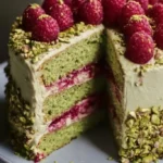 This cake brings bright color and fresh taste. The green pistachios and red raspberries make it look beautiful. The cake is soft and the buttercream is nutty and smooth. It is good for a party or a special day.