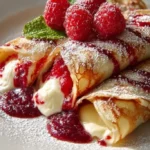 Light, thin crepes filled with sweet vanilla cream and fresh raspberries, perfect for breakfast or a dessert.