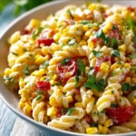 A fresh and flavorful pasta salad inspired by street corn, mixed with roasted corn, cotija cheese, and zesty lime.